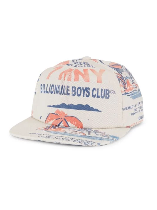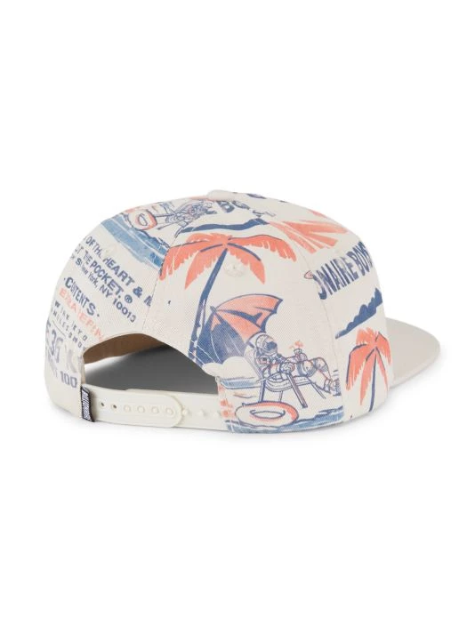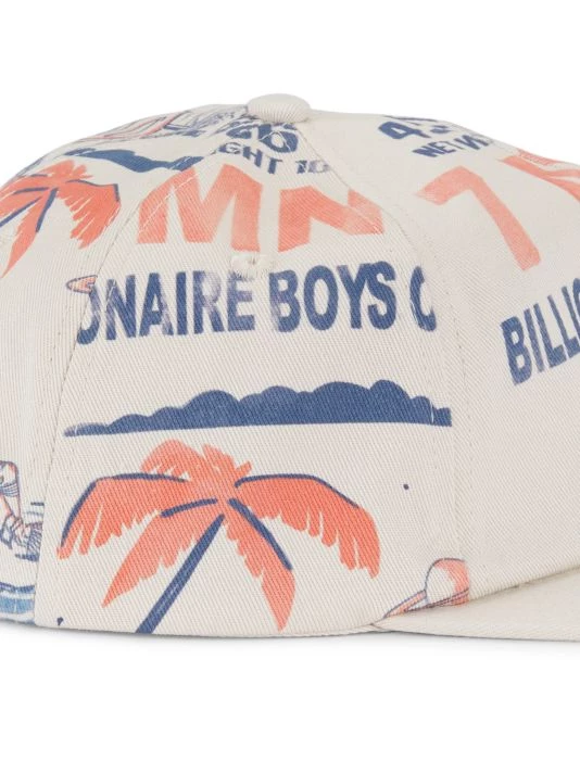 Faded text graphics and a palm tree screenprint decorate Billionaire Boy’s cotton snapback hat.
