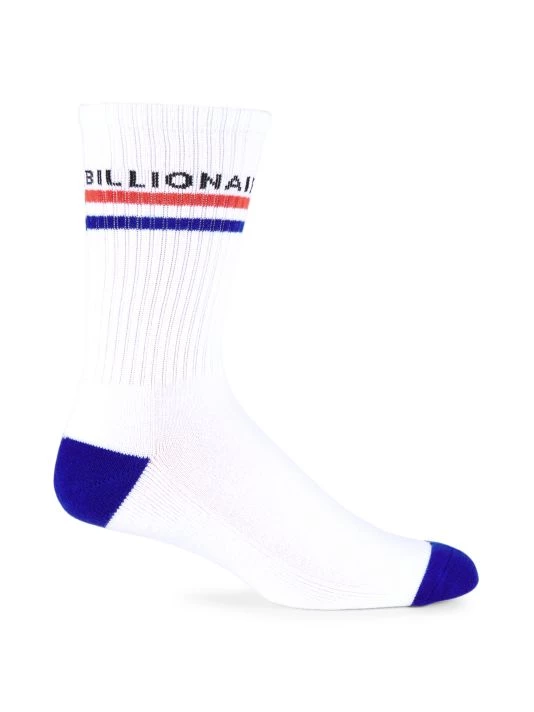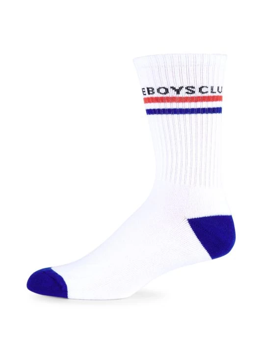 Knit calf socks with dual stripes and wrapped brand logo accent.