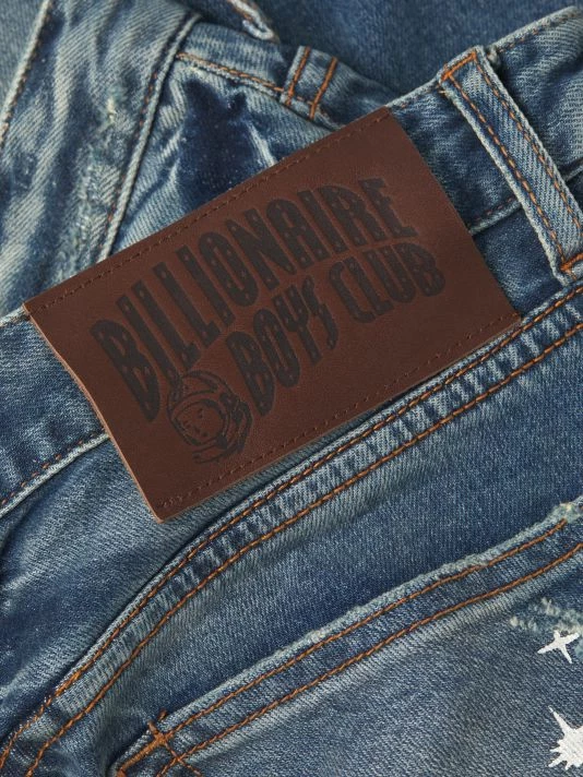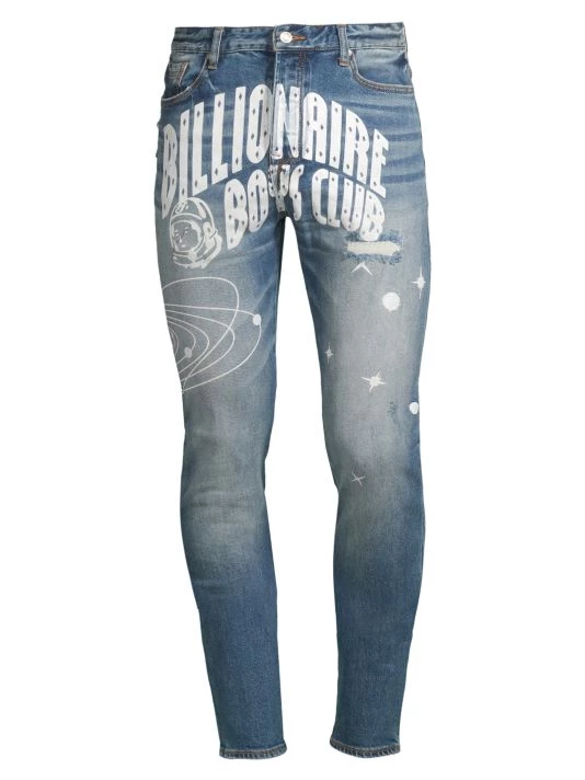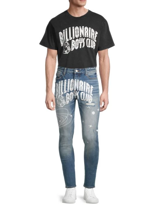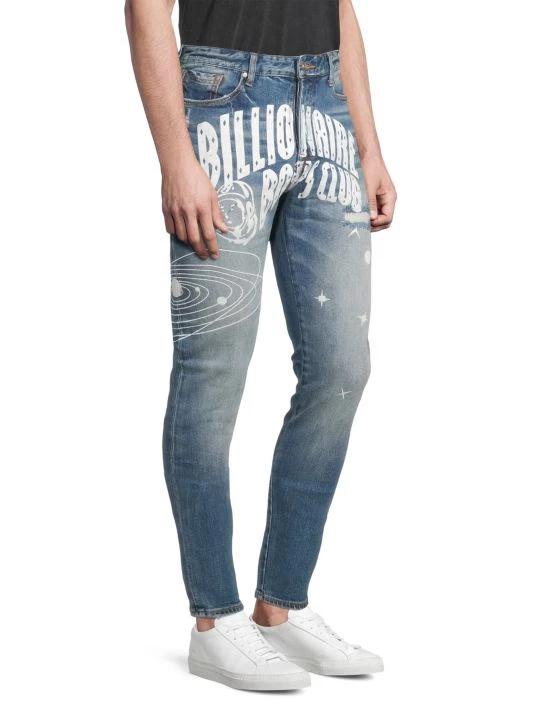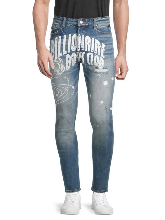 These skinny jeans in a five-pocket silhouette feature galactic-inspired embroidery, a logo on the front, and an intentionally distressed accent.