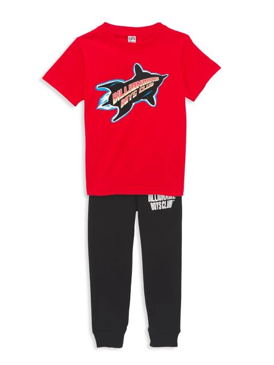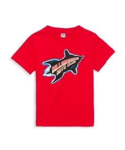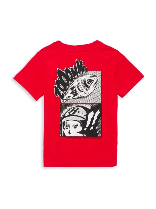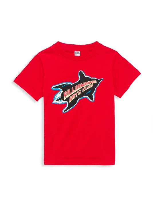 This crewneck T-shirt sports a rocket graphic showcasing a whimsical logo accent.