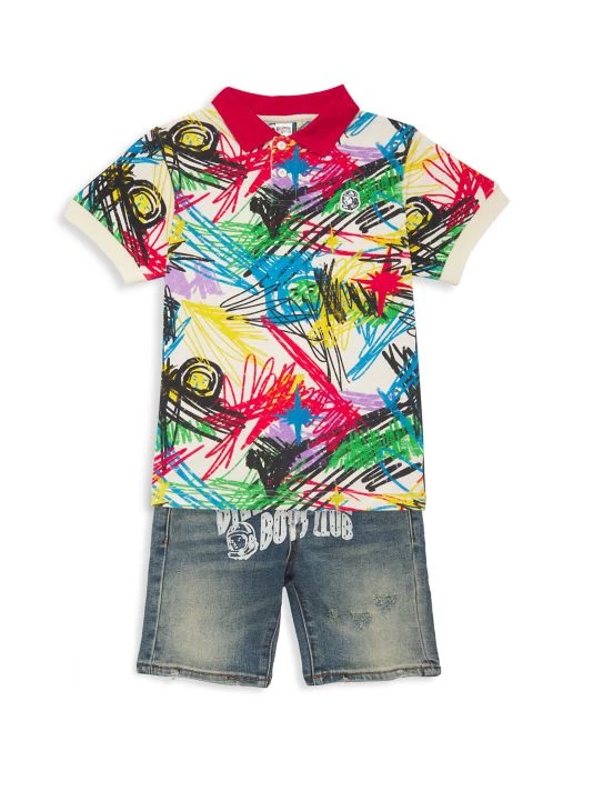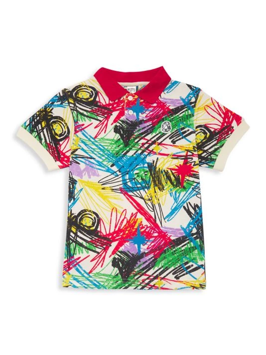 This short-sleeve polo is adorned with a vibrant scribble-inspired doodle print and an embroidered astronaut logo on the chest.