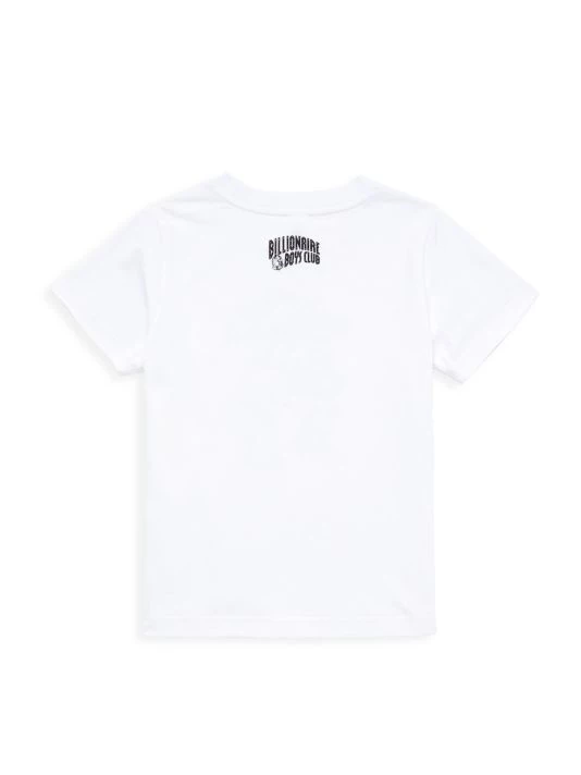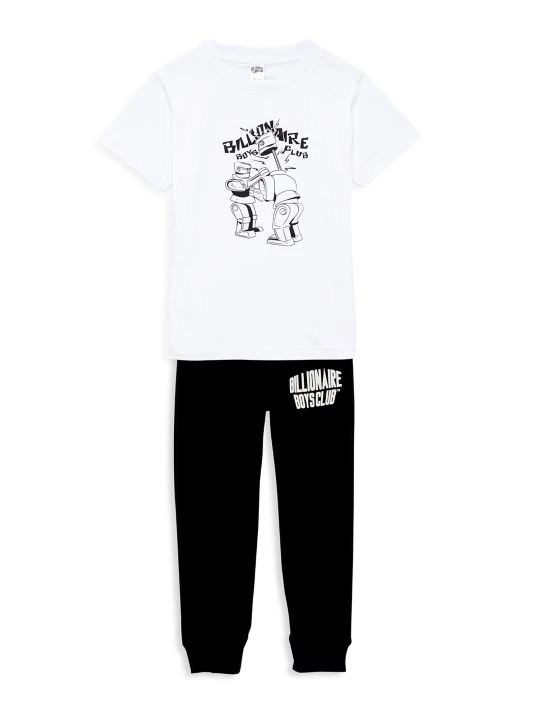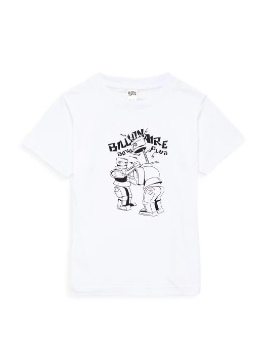 Classic rock `em sock `em robots enhance the logo design on the front of this casual T-shirt.