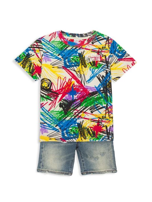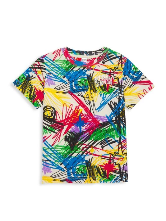 This jersey crewneck T-shirt showcases a vibrant scribble-inspired doodle astronaut print.