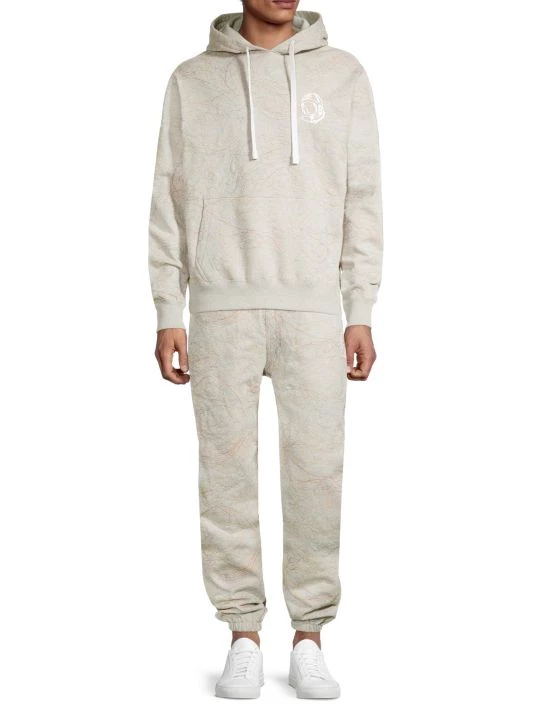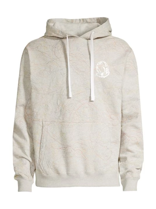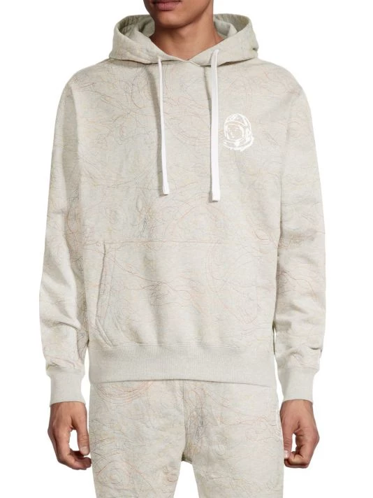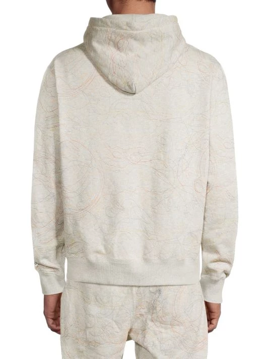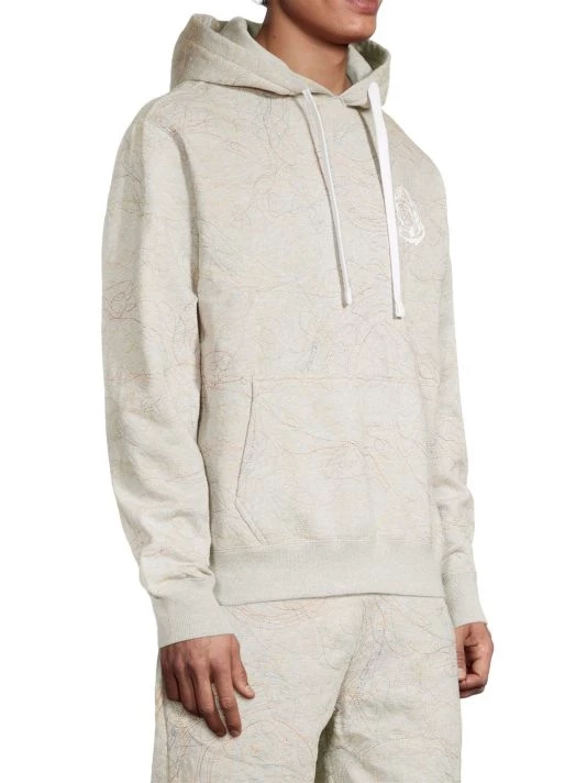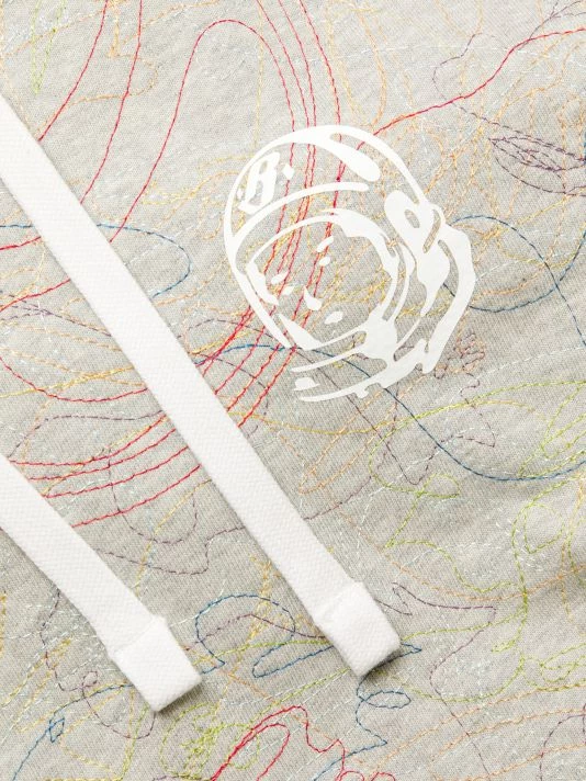 This hooded quilted sweatshirt showcases multicolor embroidery in a scribble style.