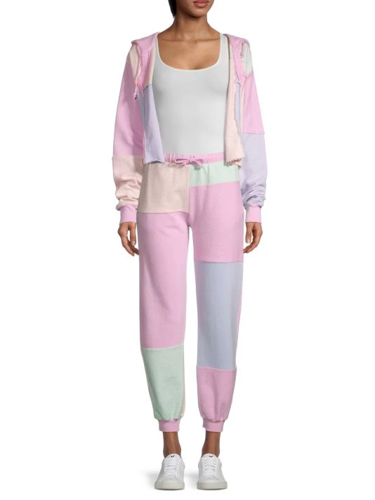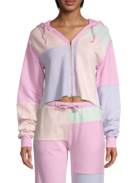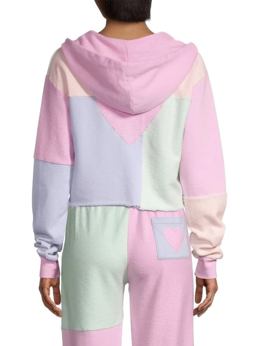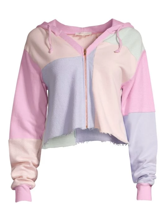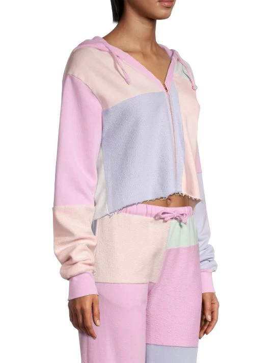 Patchwork coloring adds style and dimension to this hoodie, designed with a cutoff cropped shape.