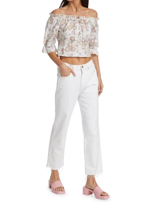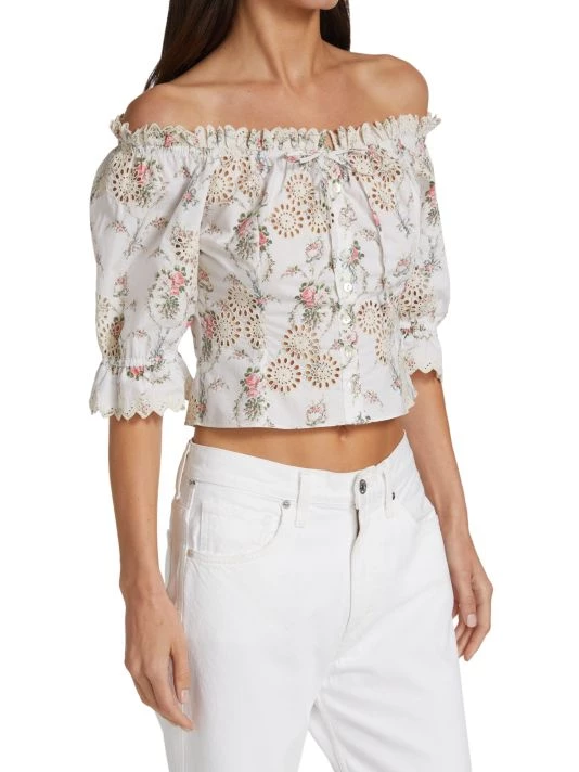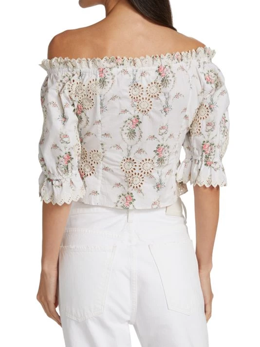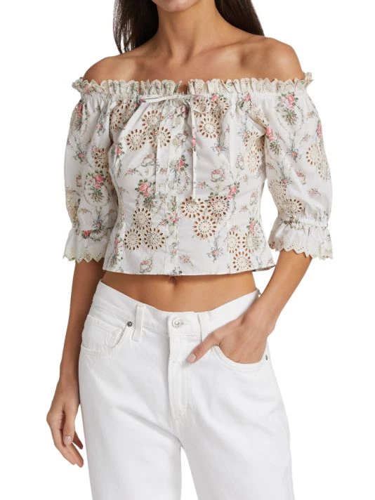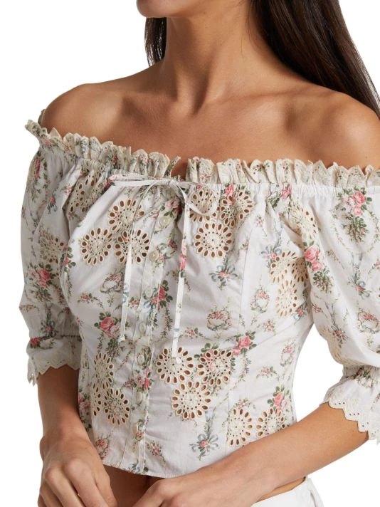 Eyelet lace and ruffle details finish this off-the-shoulder crop top.