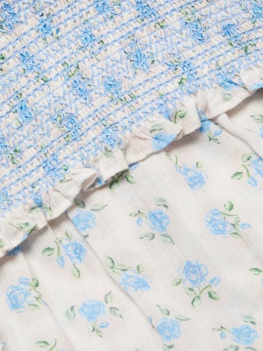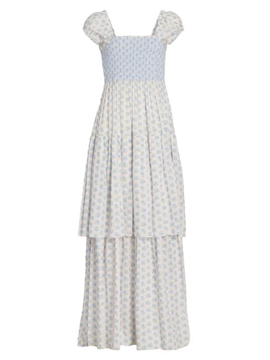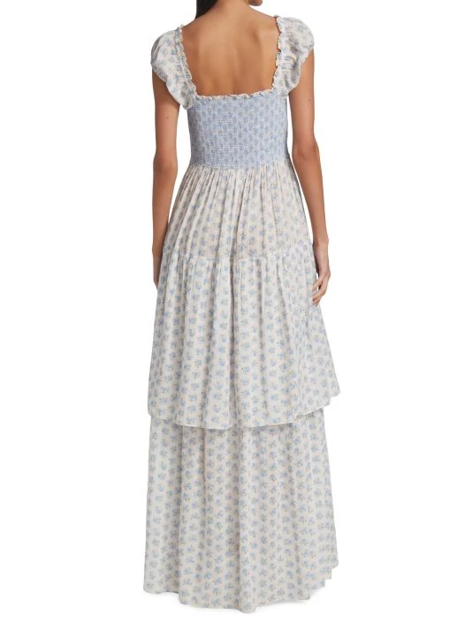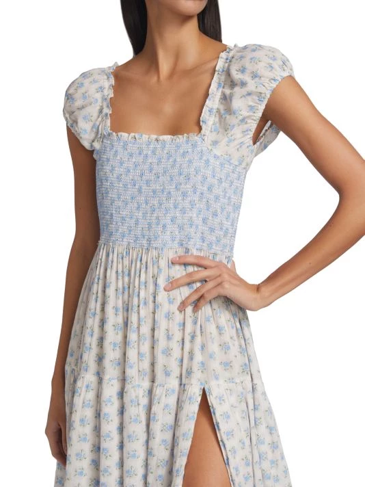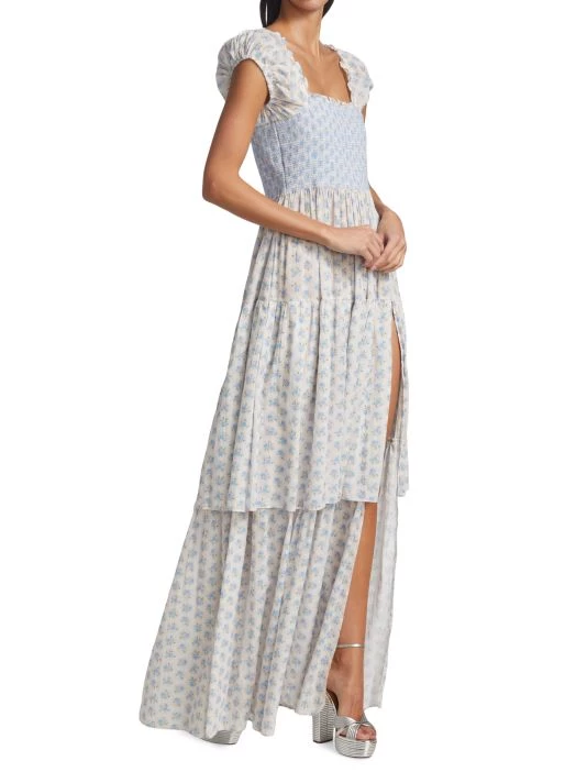 Crafted of floral-print cotton, the Anzie maxi dress from LoveShackFancy features a square-neck bodice with cap puff sleeves. A tiered skirt with a thigh-high slit completes this flowing style.