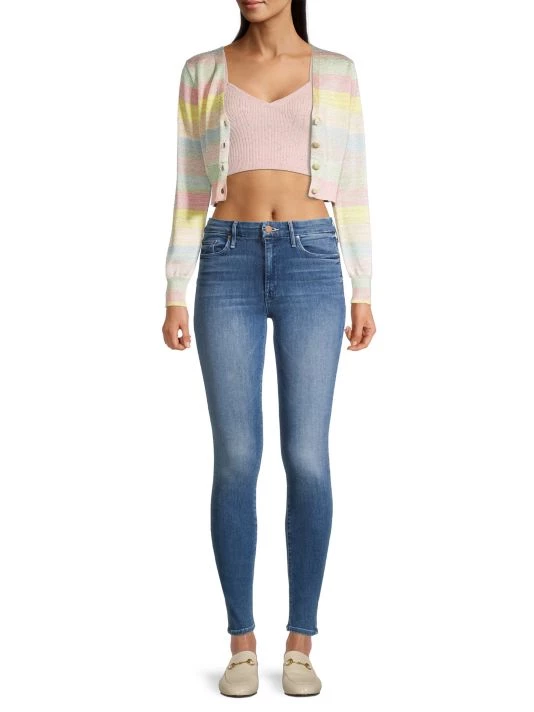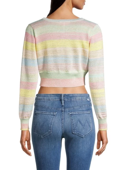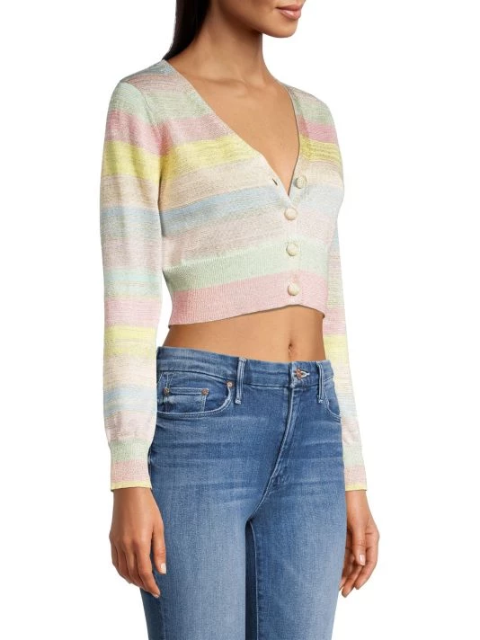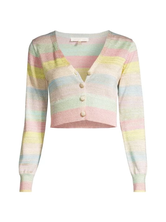 Decorated with multicolored stripes, LoveShackFany’s Asteria cardigan is cut in a cropped silhouette. This lightweight piece is enhanced with a flattering V-neck.