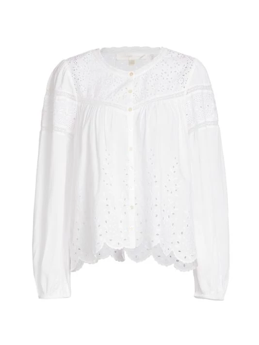 This eyelet-embroidered blouse features a button-front with a scalloped hem.