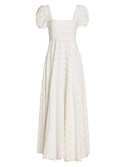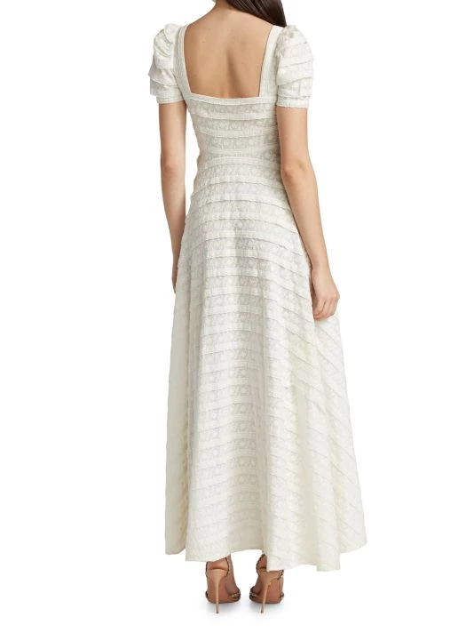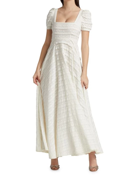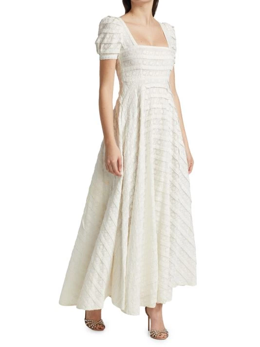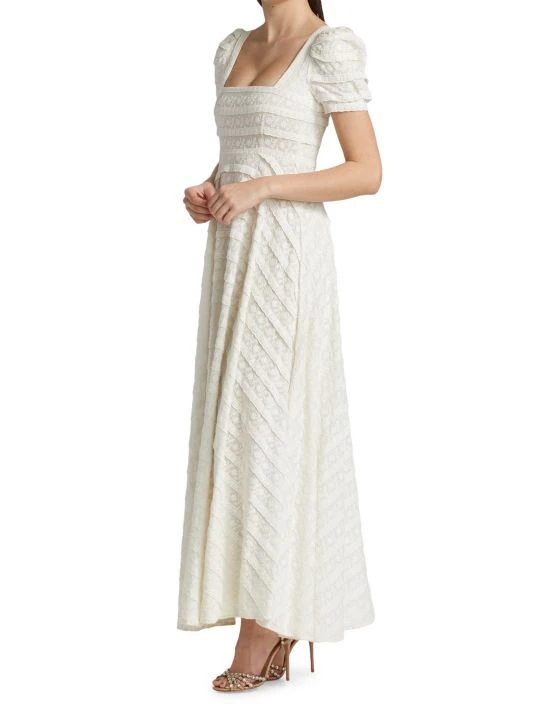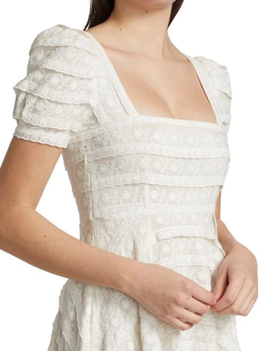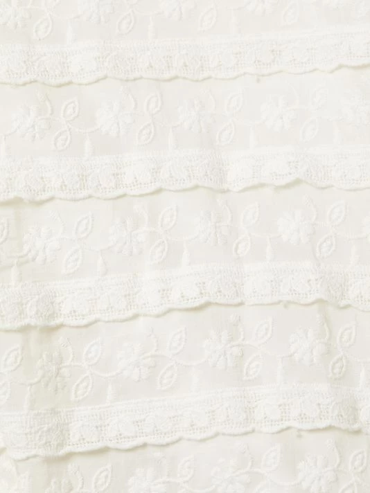 From the Bridal Collection. The Ryan dress in Catalina Lace is romantic and playful, designed with alternating rows of embroidered floral motifs and scalloped lace trim.