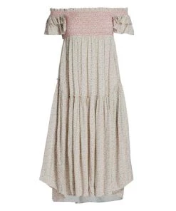 A smocked empire bodice with ruffled sleeves finishes this flowing midi dress.
