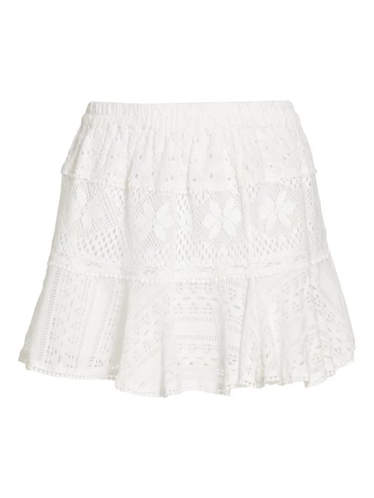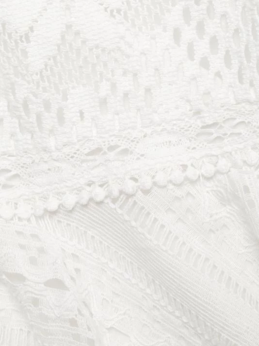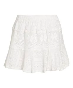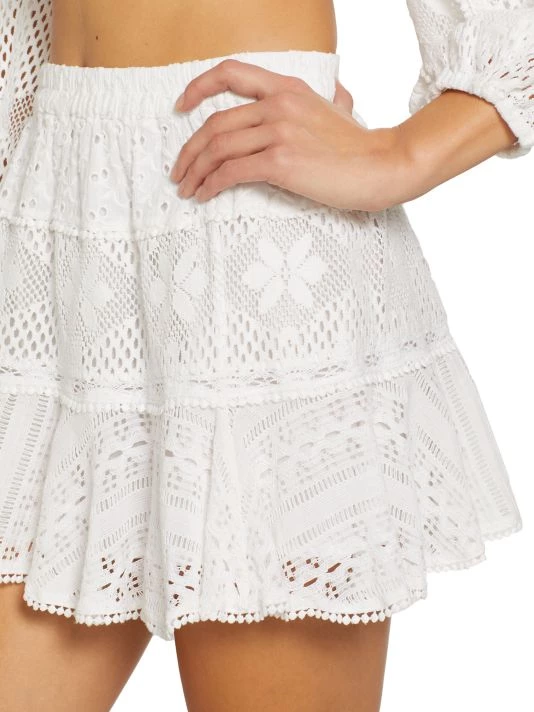 Crafted from pieced laser-cut lace, this mini skirt features a sweet flutter hem and pom-pom trim.