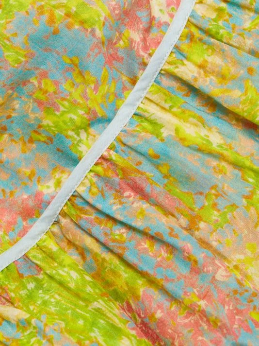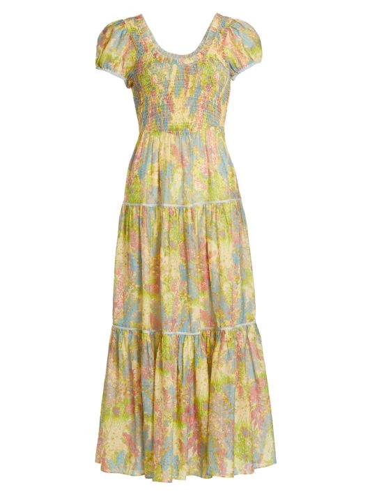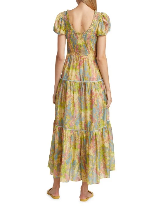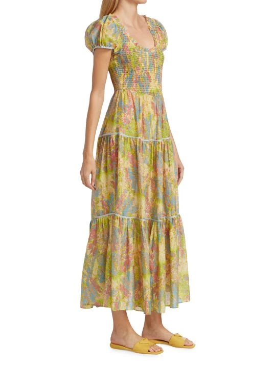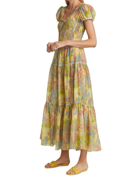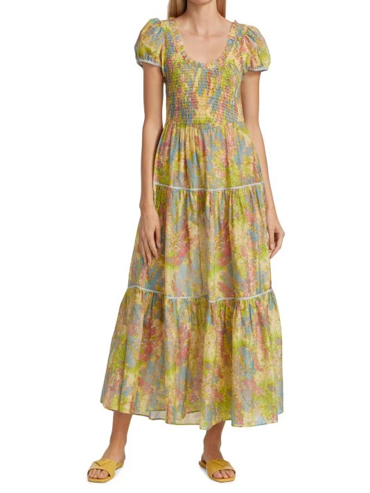 LoveShackFancy’s Elisabelle maxi dress is adorned with a garden floral print. This tiered style flaunts a smocked bodice with dramatic puff sleeves.
