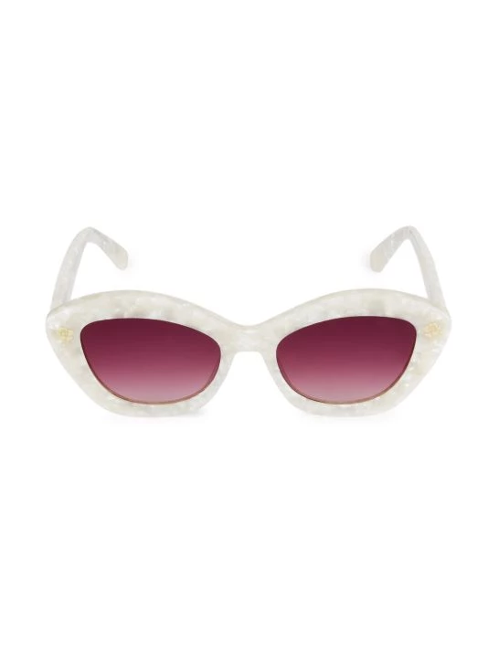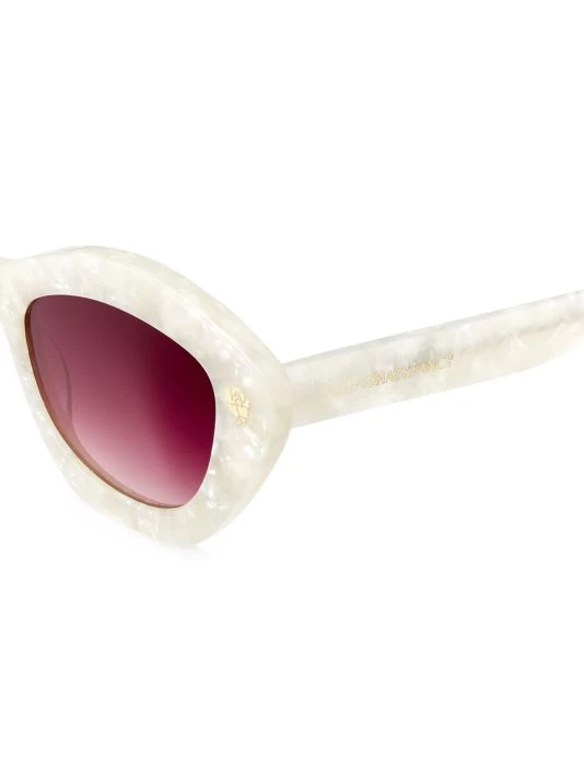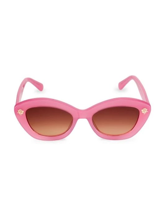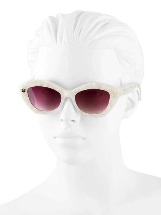LoveShackFancy’s Hessel sunglasses flaunt a bold cat-eye silhouette. Detailed with a foiled logo at the temples, this sleek pair features floral motifs at the front.