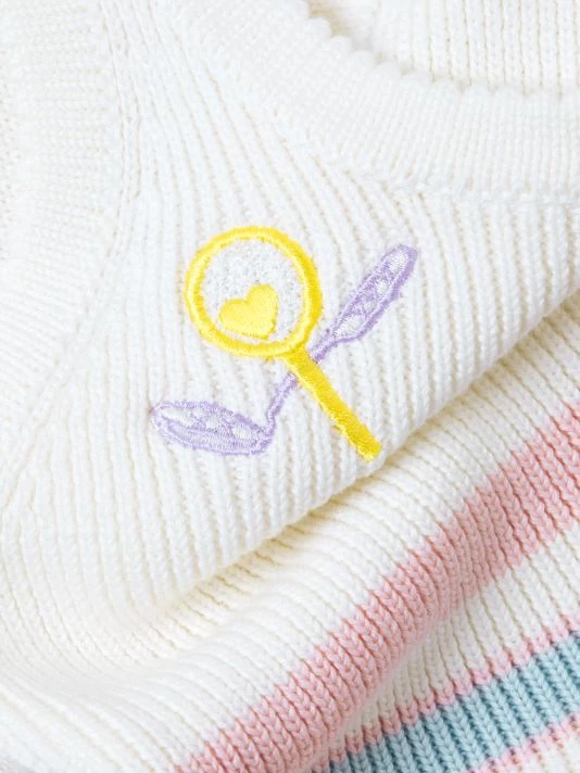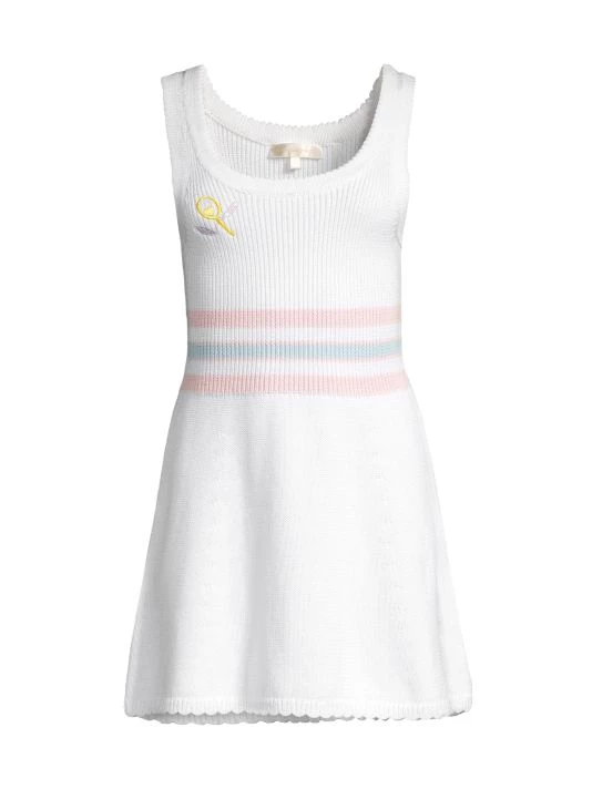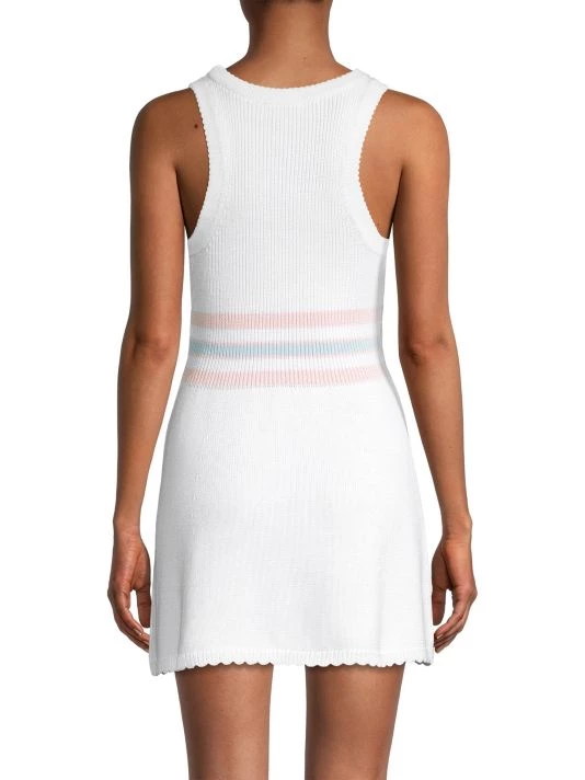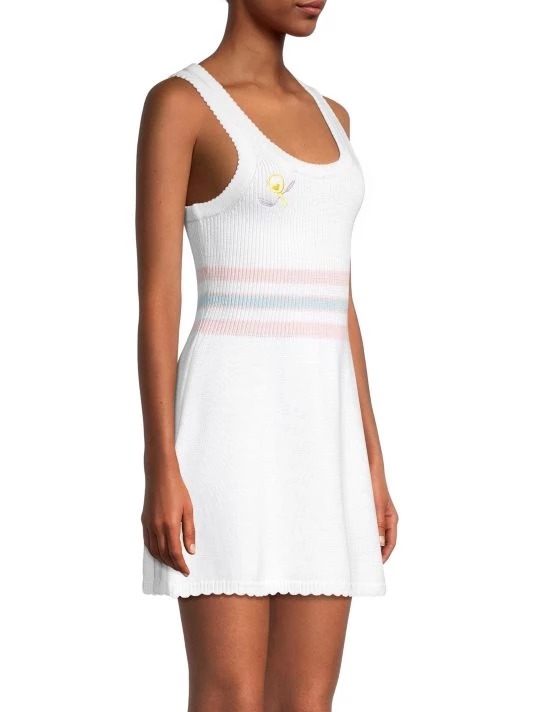 This scallop-trim minidress features embroidery at chest and striping at waist.