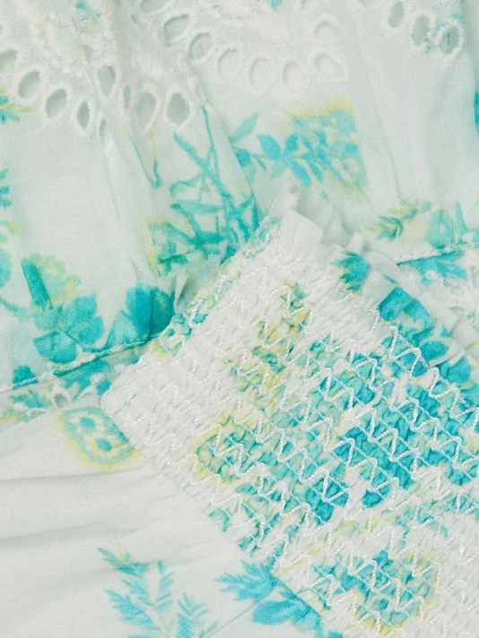 LoveShackFancy’s Jimena miniskirt is crafted of floral-print cotton with embroidered details. This style features a smocked waistband, ruffles, and eyelet trim.