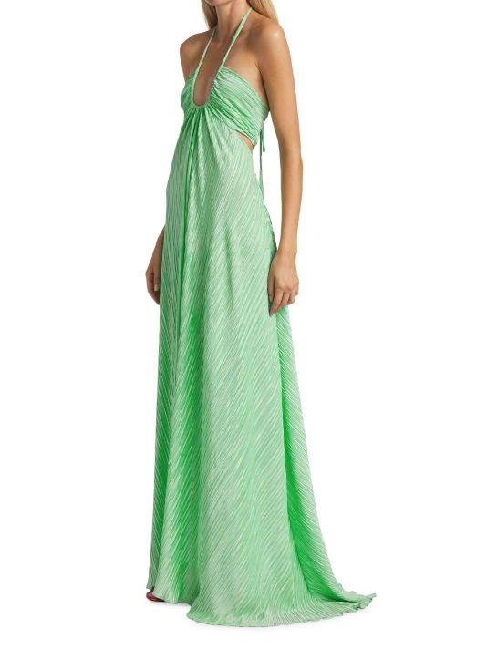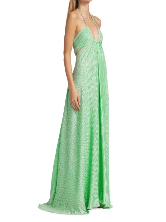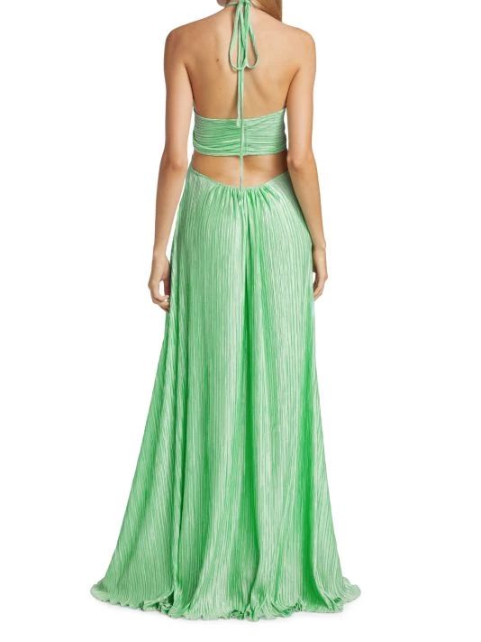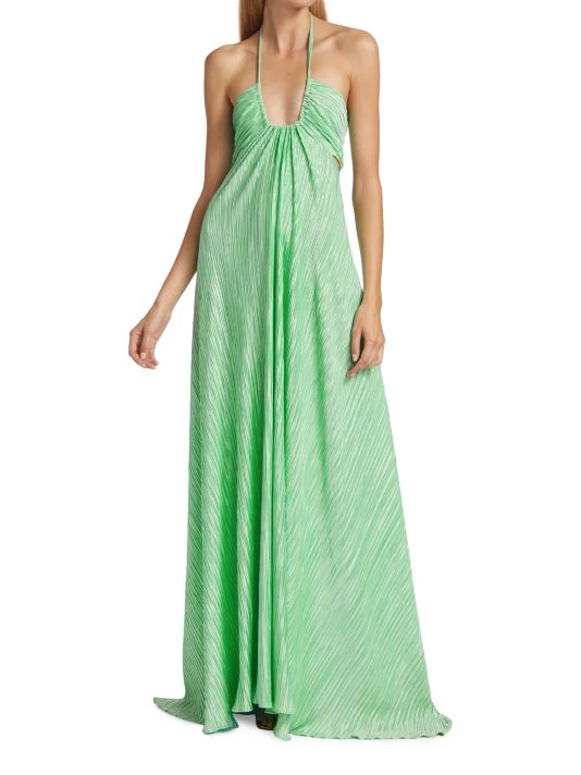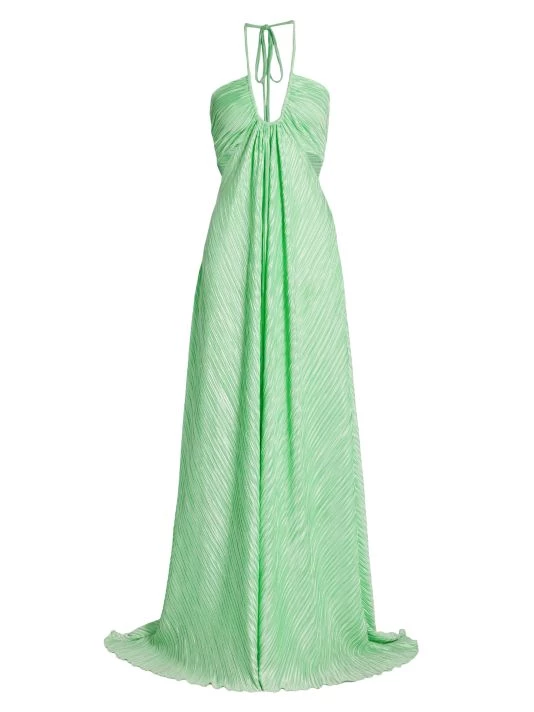 Plissé-pleated maxi-dress with a plunging U-neck and sleek open back.