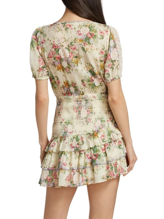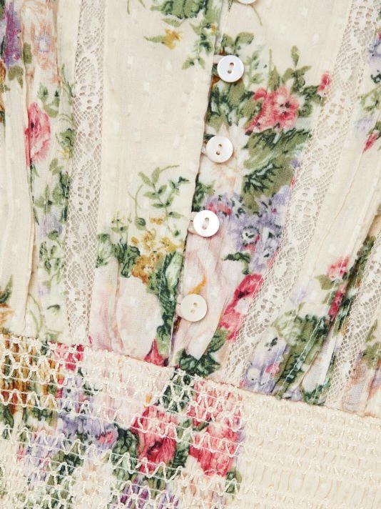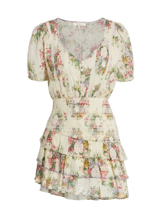 LoveShackFancy’s Keelin dress is crafted of Swiss dot cotton with delicate lace inserts. Trimmed with contrast whipstitch, this flirty style features short sleeves, a smocked waistband, and a tiered asymmetric skirt full of flounces.