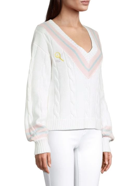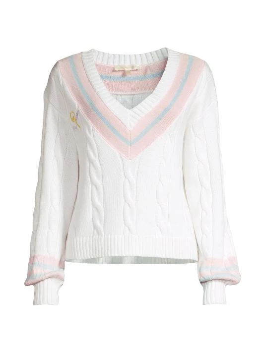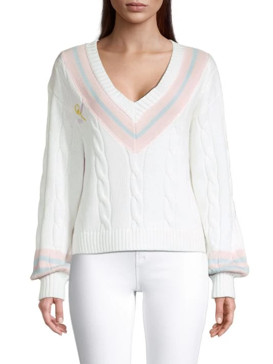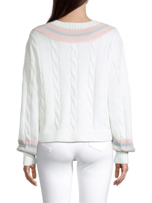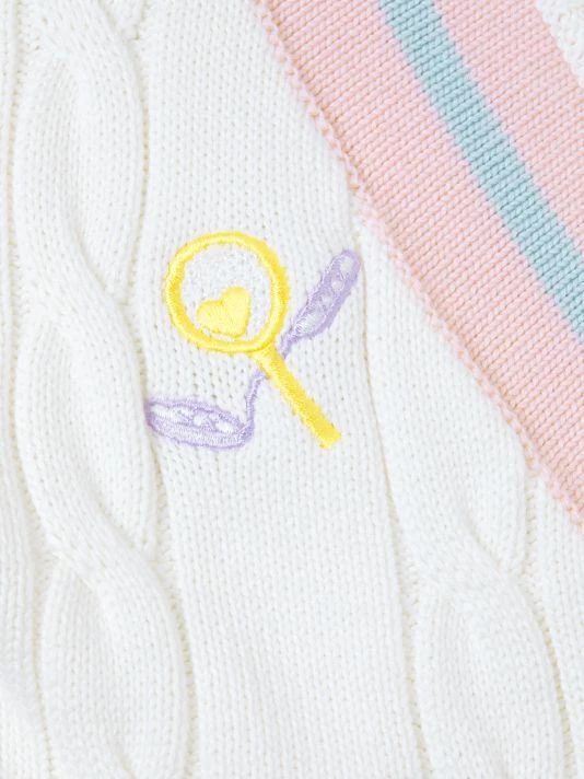 This oversized cable knit sweater is complete with embroidery at chest and contrast striped trim.
