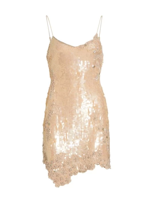 The Meline minidress is detailed with sparkling metallic sequins and floral embroidery.