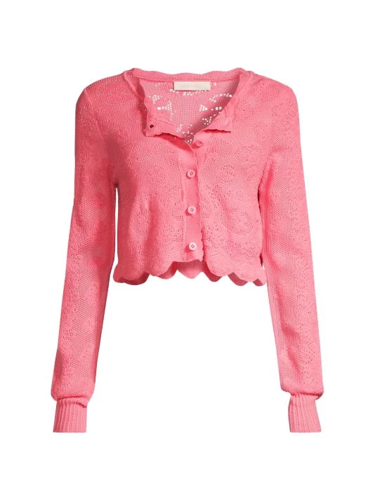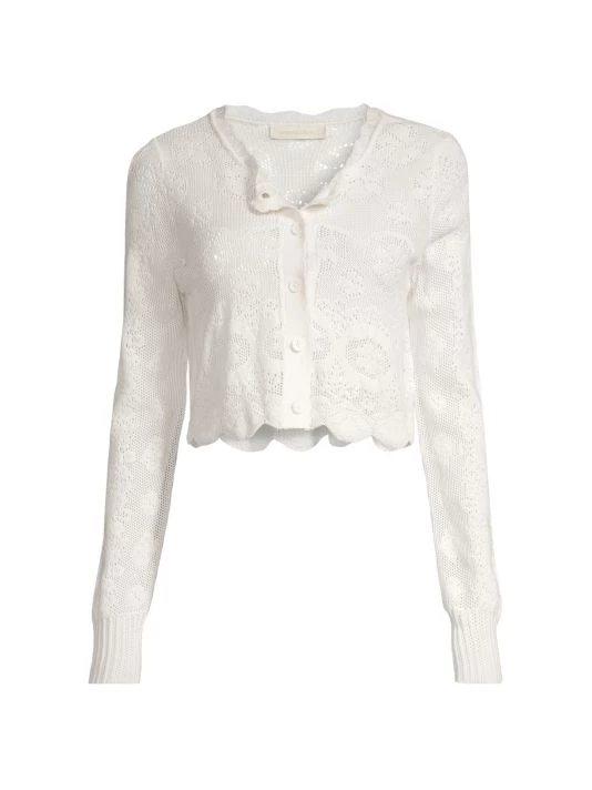 Cut in a cropped silhouette, LoveShackFancy’s Muriel cardigan is designed with intricate floral crochet. This lightweight piece is finished with scalloped edges.