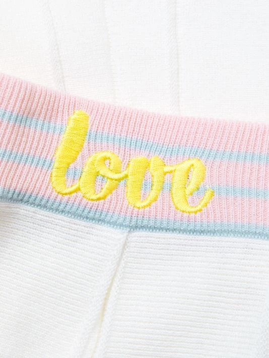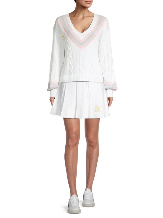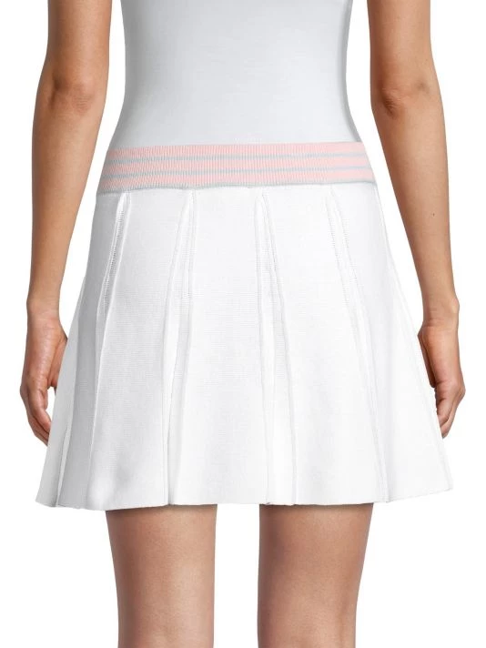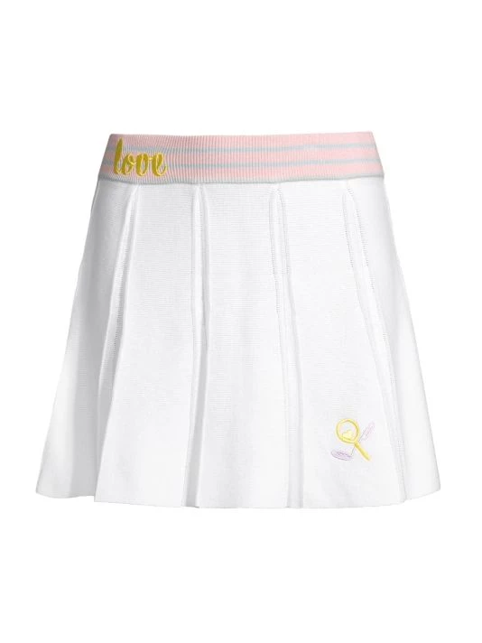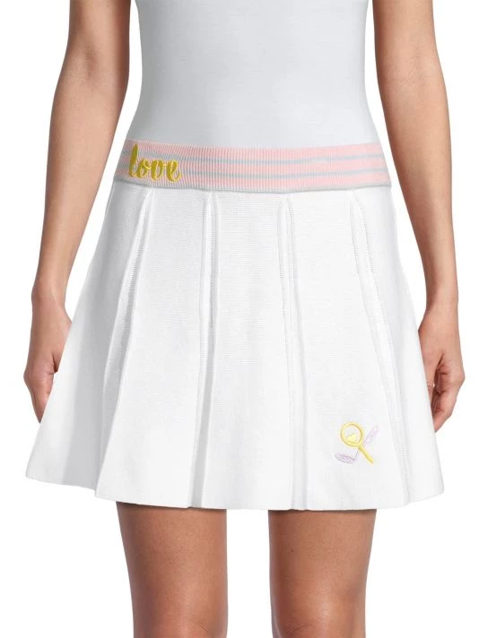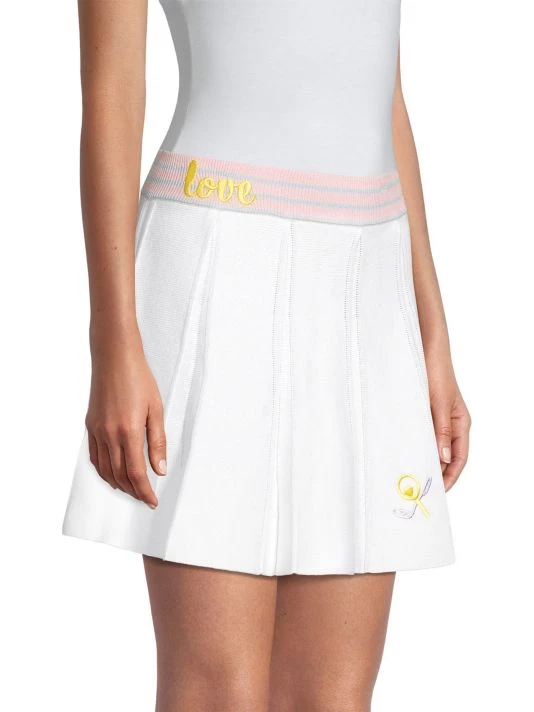 This pleated knit tennis skirt is complete with a banded striped waist and intricate embroidery.
