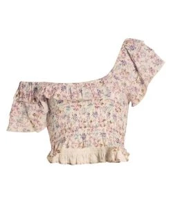 Smocked top with a soft gingham print features a cropped length and romantic ruffle at the neck.