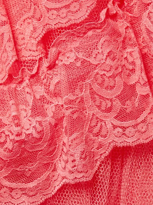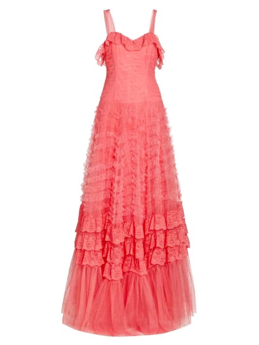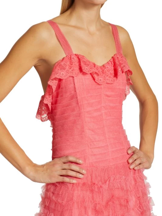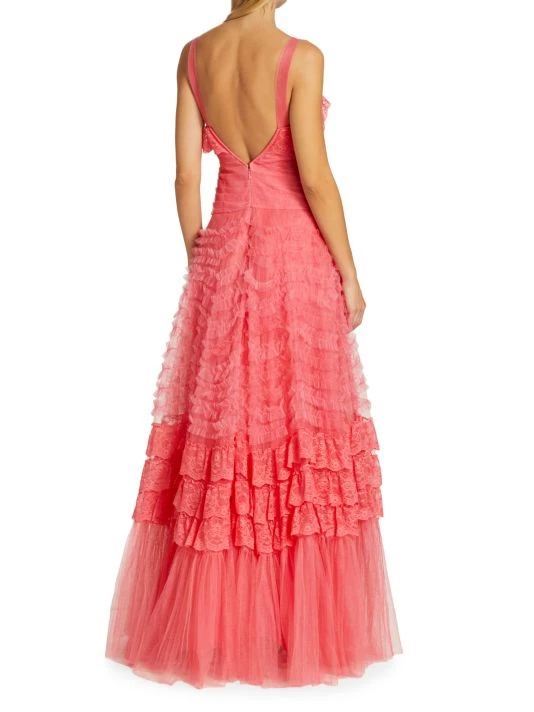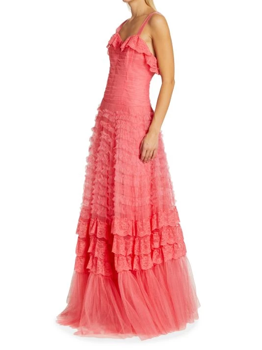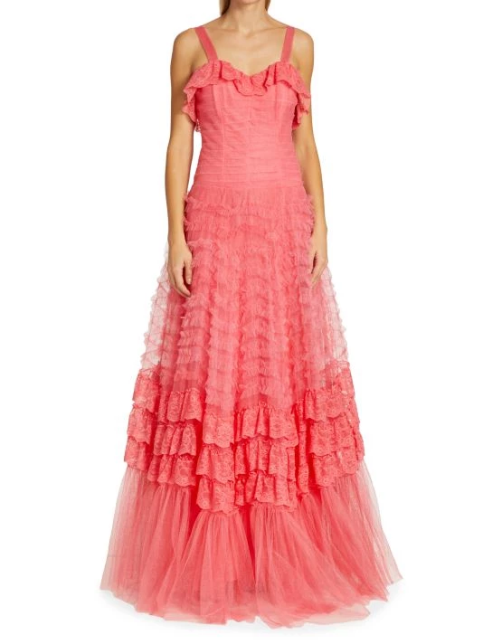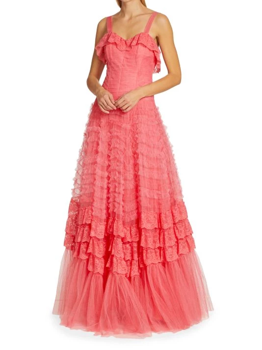 Love Shack Fancy’s Sherelle gown features a lace-trimmed sweetheart neckline and an elegant V’d back. The fitted, drop-waist bodice flares into a triple-layered skirt with raw-edge tulle ruffles, scalloped lace, and a gathered hem.