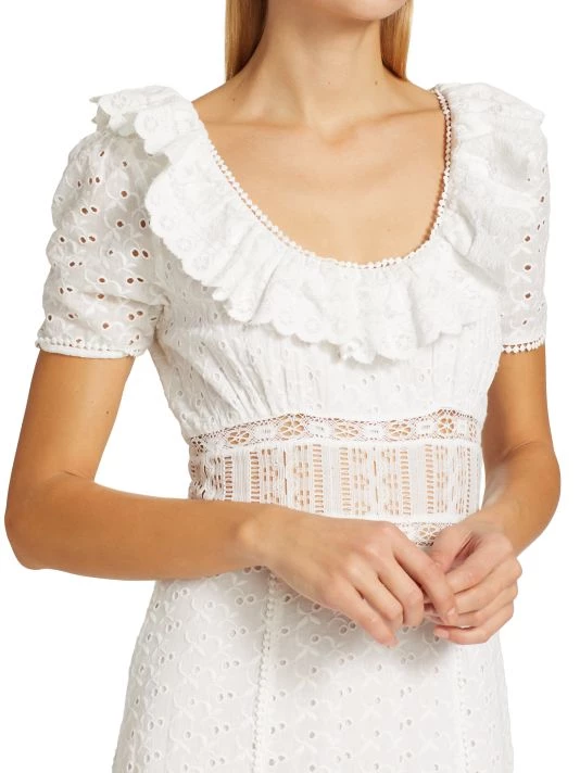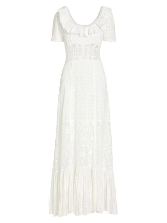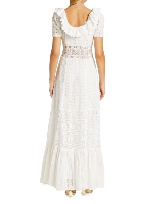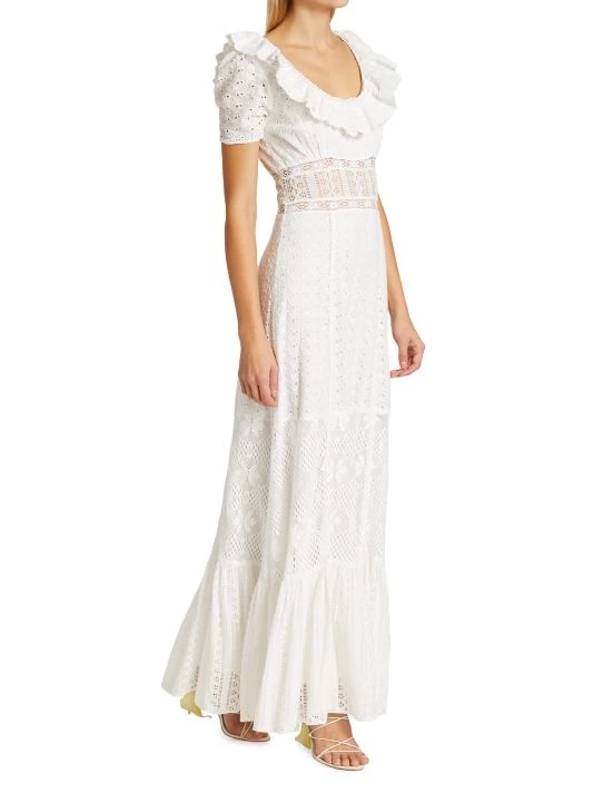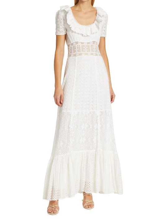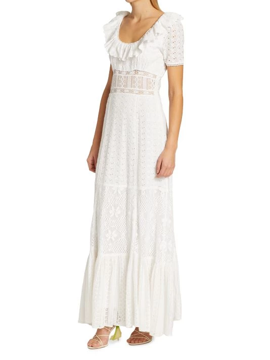 Inset lace panels shape this maxi dress, crafted from floral eyelet cotton with a tiered silhouette.