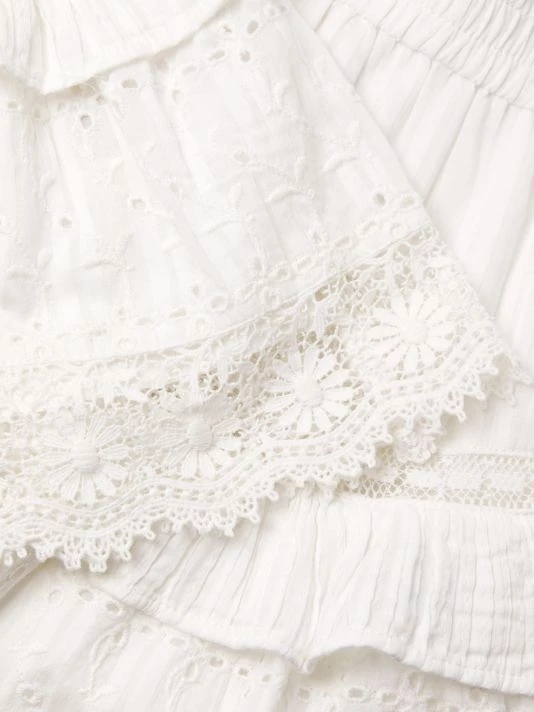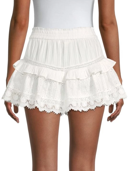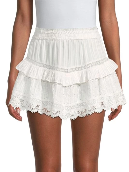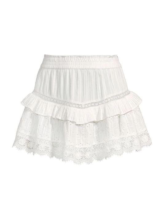 Eyelet and lace pair in this lightweight cotton mini skirt, designed with ruffle trim.