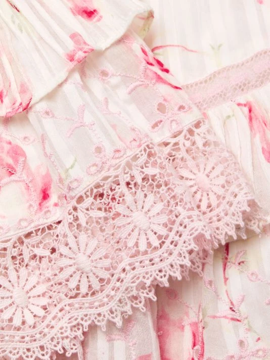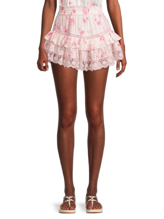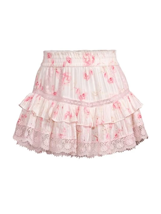 Crafted of floral printed lightweight cotton, LoveShackFancy’s Tanisha skirt flaunts ruffled panels trimmed with intricate lace.