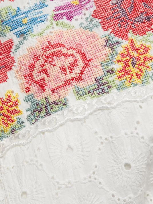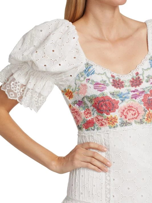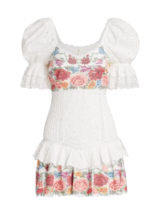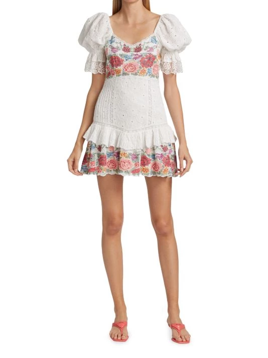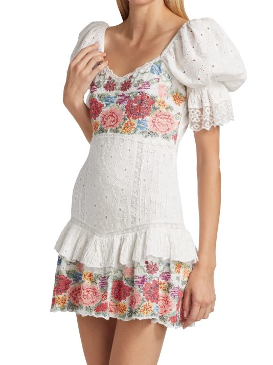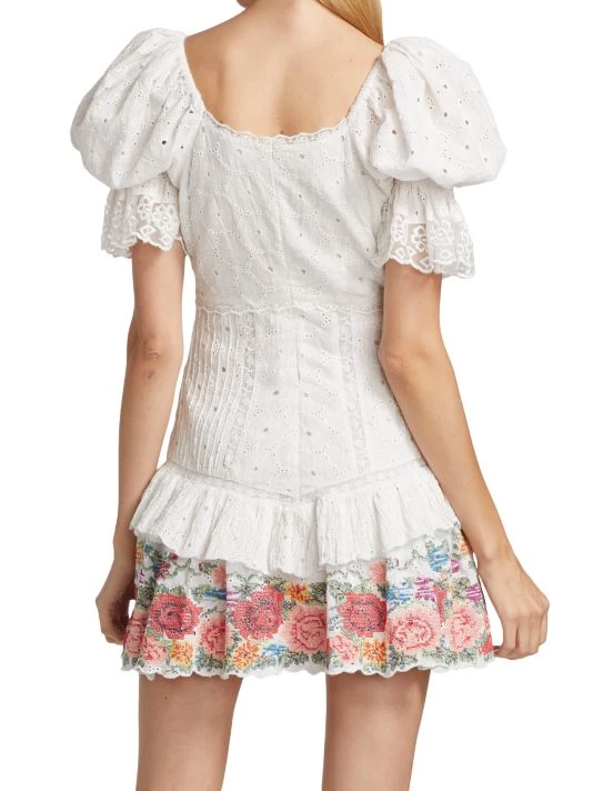 This eyelet-embroidered minidress features puff sleeves with a ruffled hem.
