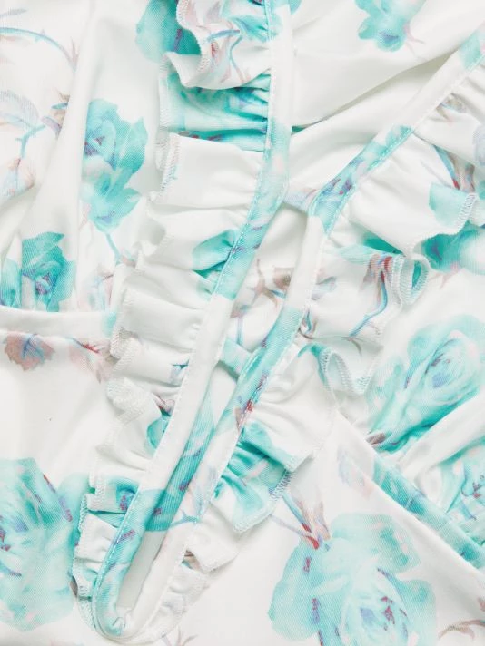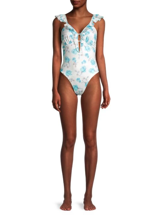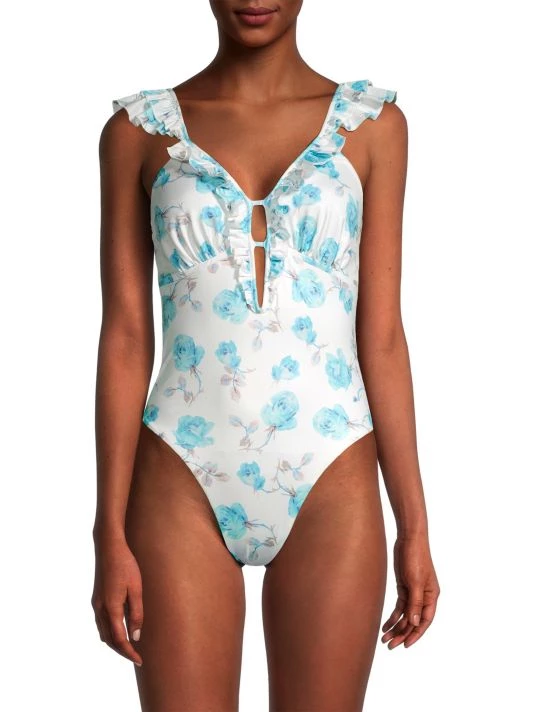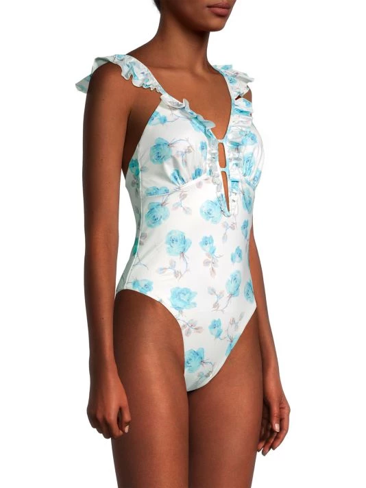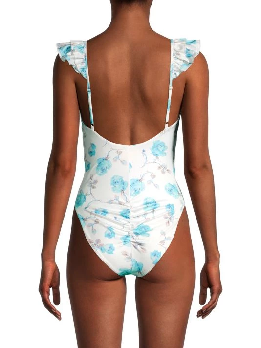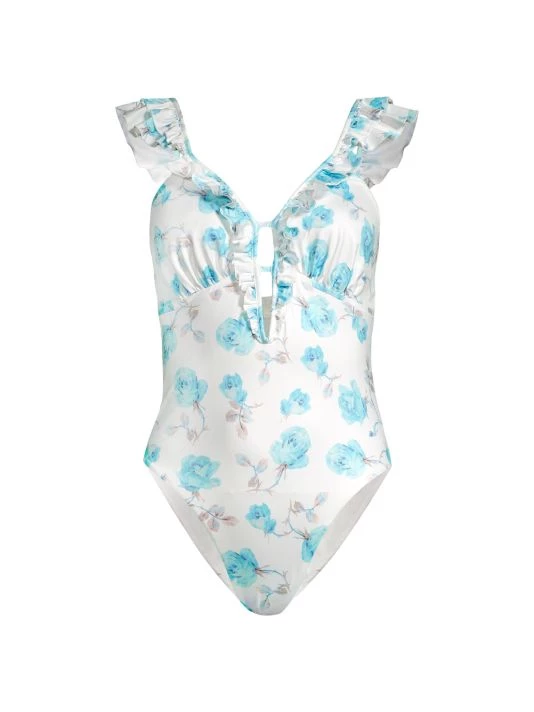 Crafted of floral-printed fabric, the Tibbie swimsuit by LoveShackFancy is adorned with a lovely ruffle-trim.